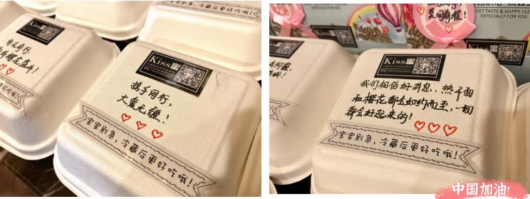 蛋糕盒上貼著為武漢加油,為大家鼓勁的小紙條,滿滿的都是感動和力量。